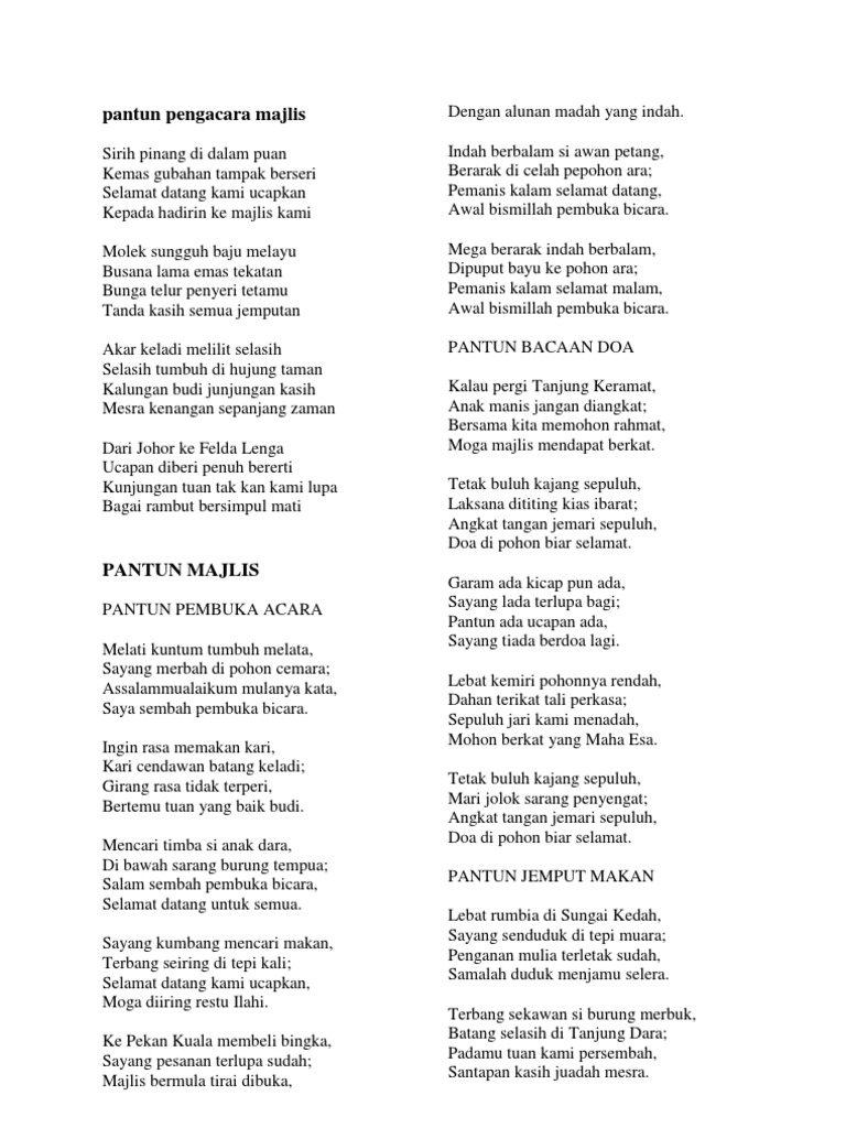 Pantun Pengacara Majlis from imgv2-1-f.scribdassets.com Bahasa melayu tahun 4 tatabahasa. 2015 sistem galeri foto sapd. 2015 sistem galeri foto sapd. Ahmad sanusi husain com koleksi hadith hadith pendek. Koleksi pantun majlis philosophia bahasa melayu bacaan doa kalau pergi tanjung keramat anak manis jangan diangkat bersama kita memohon rahmat moga majlis mendapat berkat tetak Pantun majlis makan malam teks pengacara majlis malam jasamu di kenang. Pohon berangan tempat bertemu, girangnya rasa si anak dara; Soalan bm tahun 6 bahasa melayu.