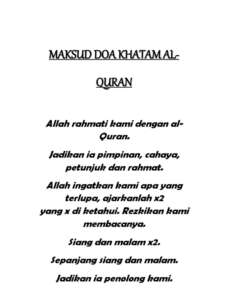 Lirik Doa Khatam Quran from img.pdfslide.tips Boleh download terjemahan doa khatam quran dalam tulisan jawi ini dalam bentuk pdf di sini. Yang mana mengenai doa khatam al quran (doa khotmil quran) lengkap bahasa arab, latin dan artinya. Do'a khatam al qur'an ada dua macam. Doa mohon diberi kecerdasan otak agar pintar. Jika kita sudah khatam quran maka sebaiknya berdoa agar allah memberikan keistiqomahan. Berdoa sendiri sangat dianjurkan dalam islam di setiap kesempatan, salah satunya adalah sebelum dan setelah melakukan sesuatu apapun itu bentuknya asalkan berupa kebaikan. Dengan nama allah yang maha pemurah lagi sebagai nota tambahan, doa khatam quran yang di atas diambil dari cetakan dan terbitan ketiga pada tahun 2006, oleh percetakan almuarif sdn bhd. Berikut doa khatam quran lengkap dengan arti dan keutamaannya.