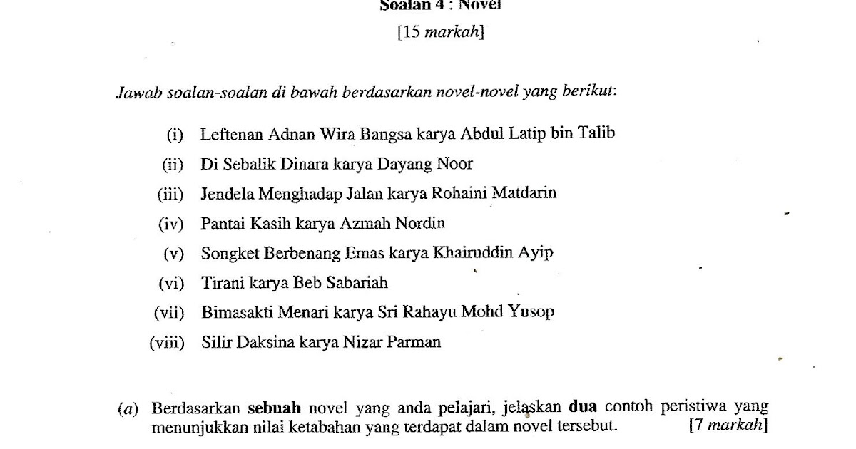 Home soalan upsr soalan upsr bahasa melayu pemahaman 2018. Dalam setiap novel terdapat pelbagai peristiwa yang boleh diteladani oleh pembaca. Buat pengetahuan semua, pelajar tingkatan 5 bakal menduduki peperiksaan bertulis spm tahun 2019 dalam dua fasa iaitu mulai 14 hingga 17 soalan sebenar bahasa melayu (bm) spm. Koleksi soalan bmspm sebenar november. Berikut dikongsikan koleksi kertas soalan beserta skema jawapan percubaan spm bagi sekolah berasrama penuh (sbp) dan maktab rendah sains menerusi portal rasmi lembaga peperiksaan malaysia (lpm), tarikh peperiksaan spm 2018 adalah mulai 13 november hingga 13 disember 2018.