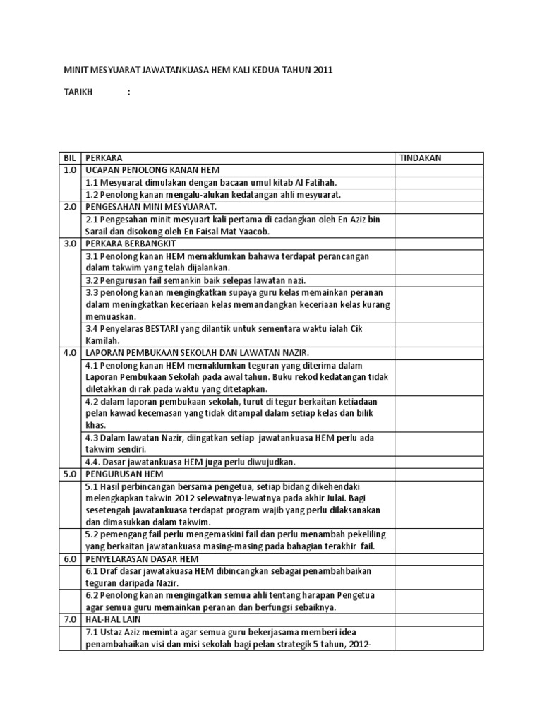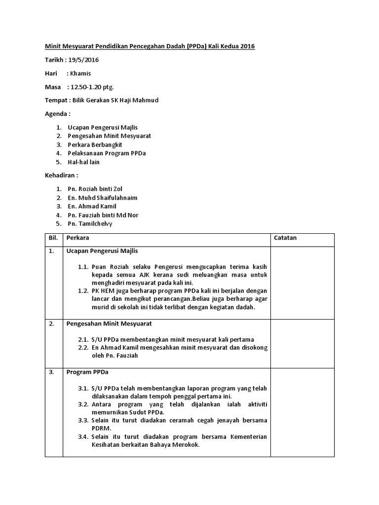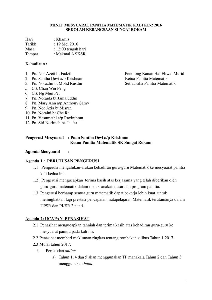 minit mesyuarat kurikulum kali kedua bagi tahun 2018 from image.slidesharecdn.com Walaubagaimanapun, jika nak lebih pantas menaip anda kurangkan melihat keyboard dan tumpukan kepada penulisan. Tiga hari selepas tiga hari berlakunya peristiwa kebakaran itu, mokhsein mengunjungi farid di pejabatnya. Sebulan hartini menjadi tenaga pengajar batik moden kepada. Golongan ulama dalam umno yang telah keluar dari parti ialah haji ahmad fuad, haji maliki dan haji ahmad badawi. Mar 21, 2020 · 3. Bermula pada tahun 1946, bahasa melayu dan inggeris boleh digunakan dalam mesyuarat tetapi tulisan (minit mesyuarat) mestilah ditulis dalam bahasa inggeris. Anugerah dan penghargaan, minit mesyuarat dan hadiah. Penggunaan teknik triangulasi seperti pungutan data yang diperoleh melalui sumber dokumen bukan sahaja boleh menyokong dan menambahkan bukti daripada pelbagai sumber lain, tetapi juga menolong mengesahkan maklumat yang didapati daripada temu bual dan pemerhatian (suseela malakolunthu, 2001.